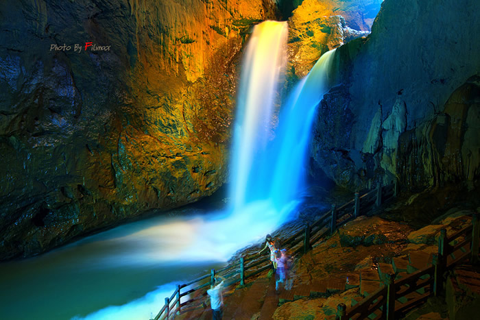 卧龙洞——洞中双飞瀑高达30米,枯水季节流量为2-3个立方米/秒,洪水季节两瀑合二为一,如一条巨型黄龙,从悬崖上訇然而下,难分雌雄。
